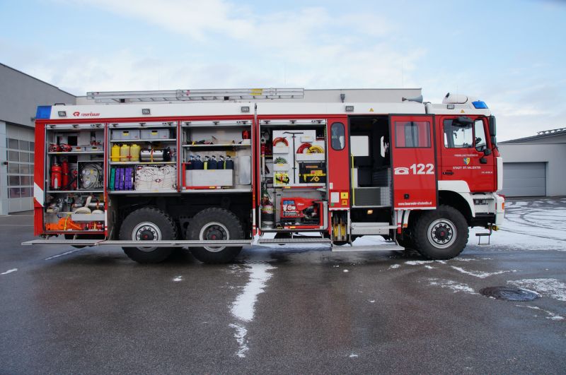 Schienenfahrwerk, Air-Slice-Schneidgerät, Langzeitatemschutzgeräte (BG4), Atemluftpufferanlage, Quickfilleinrichtung, Rettungskettensäge, 7t Seilwinde, Frontmonitor, Rettungsplattform