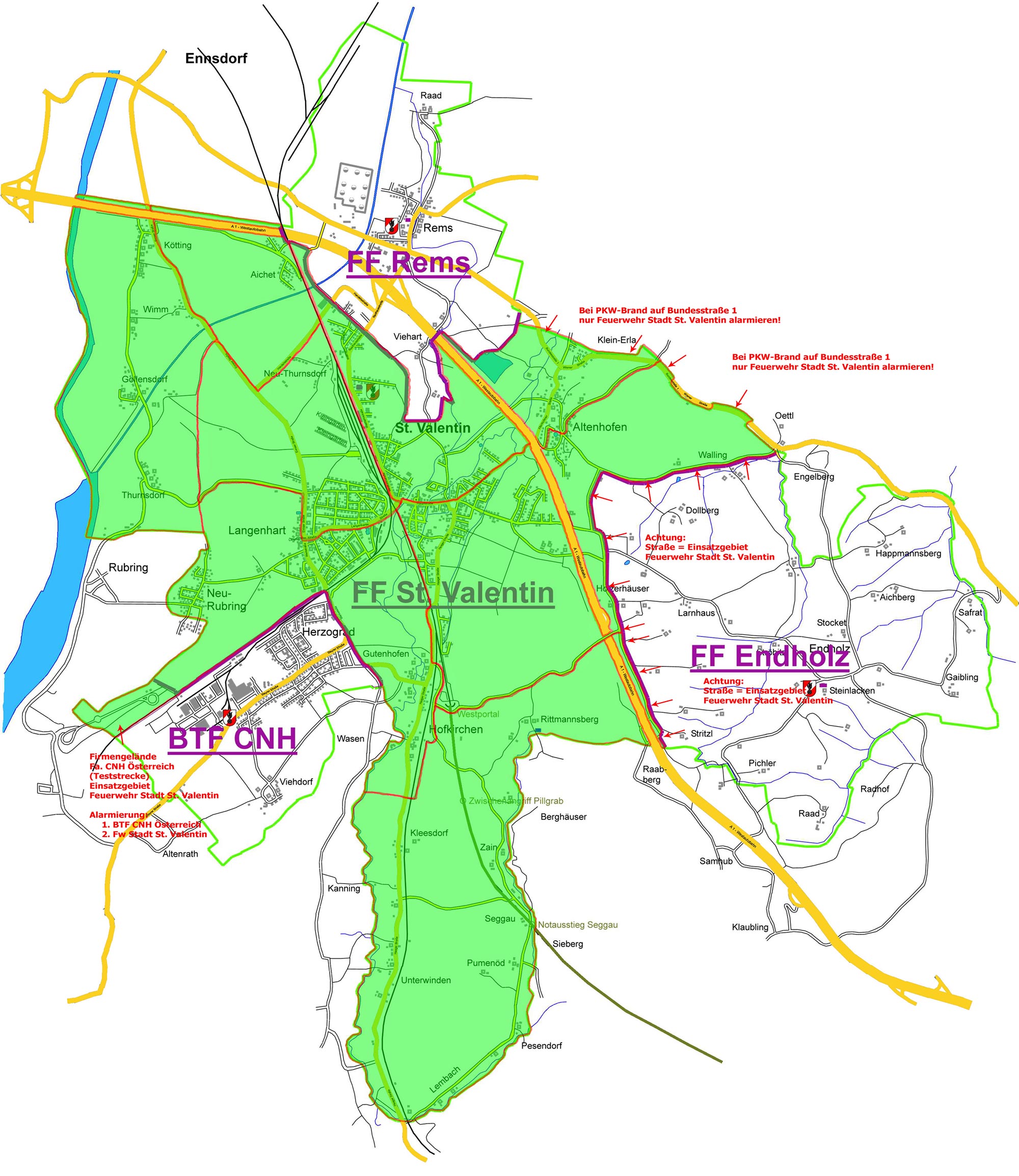 In nachstehender Grafik ist das Einsatzgebiet im Gemeindegebiet von St. Valentin der Freiwilligen Feuerwehr Stadt St. Valentin grün hervorgehoben: